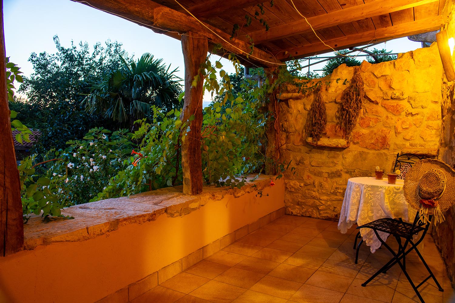 Alles ist geschützt durch eine größe überdachte Schattenterrasse, ca. 12x6m Groß, dass mit einem Tisch und mehreren Stühlen ausgestattet ist. Über großem Steingrill (ca. 1,80m lang) und eine Außendusche, ebenfalls in typisch kroatischen Still mit Steinausführung kommt man zum Schauplatz des Lapidariums: Mittelalterliche Amphitheater des Wellness Oase Lapidarium. Aus Steinblocken die zum Teil mehrere Tonnen wiegen hat man hier vor hunderte Jahren ein Schauplatz gebaut. Heute ist das Teil von Lapidarium auf Insel Krk.
