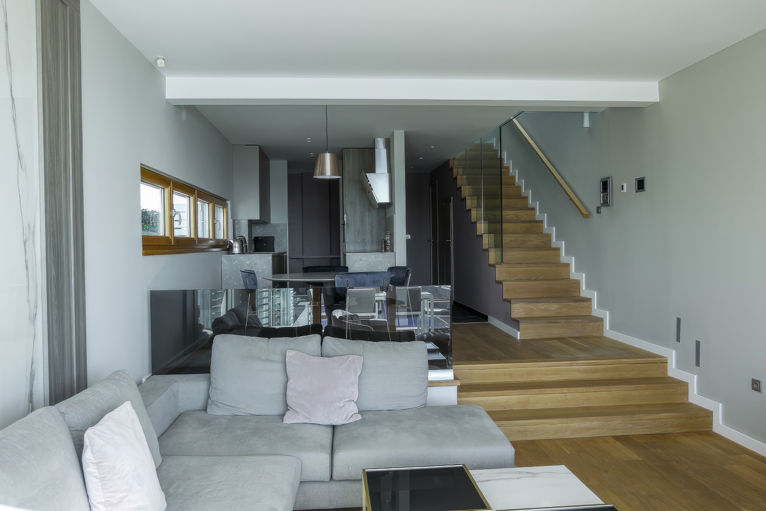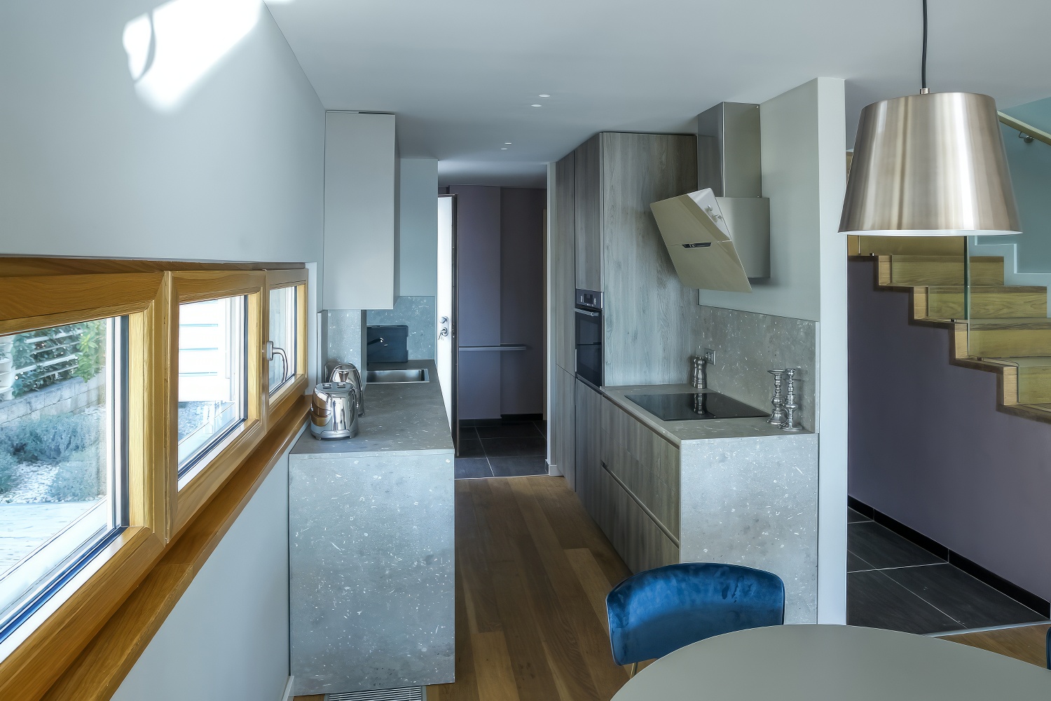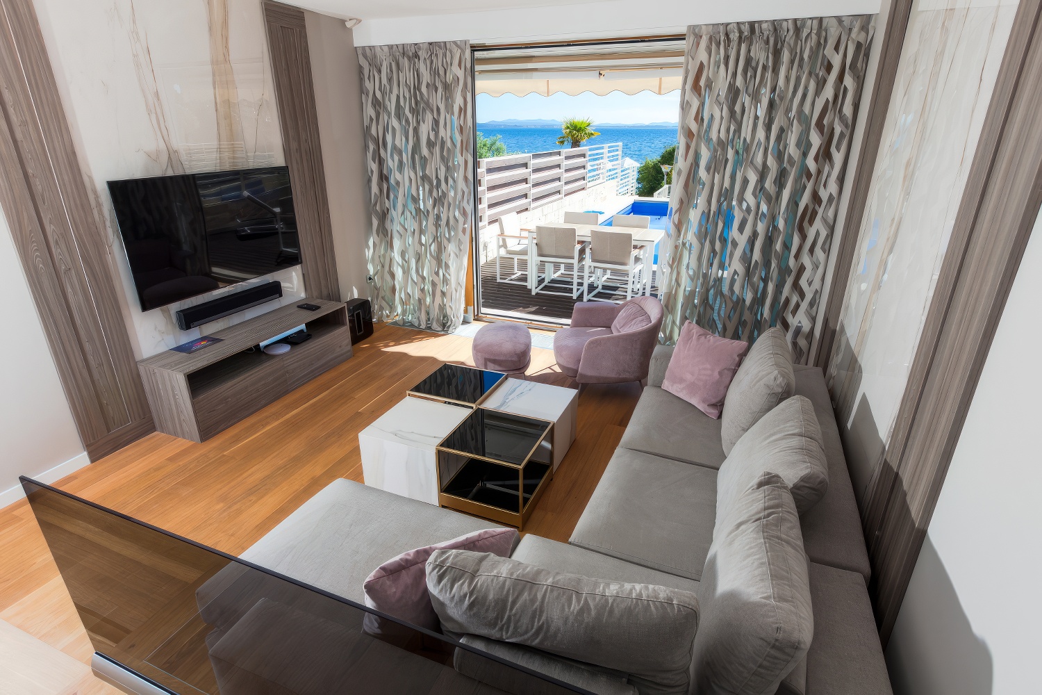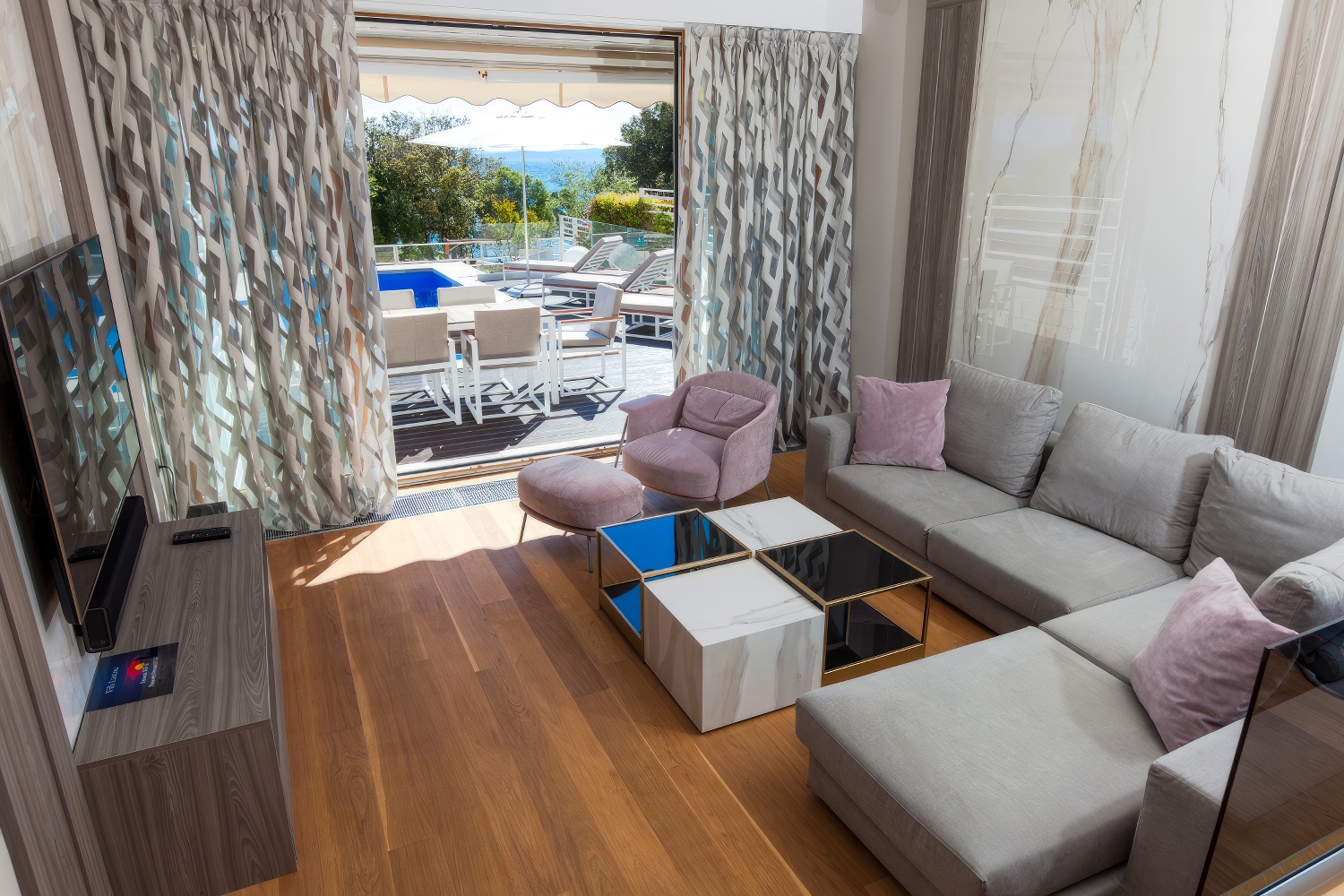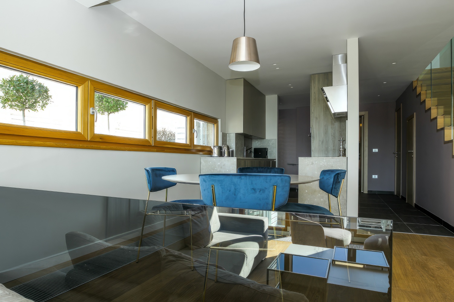 Im Untergeschoss findest du eine voll ausgestattete, moderne Küche. Angrenzend daran befinden sich ein geräumiges Esszimmer und Wohnzimmer mit direktem Zugang zur Terrasse des Hauses. Auf der anderen Seite des Untergeschosses liegt ein großes Schlafzimmer mit einem Doppelbett und einem eigenen Badezimmer. Zusätzlich gibt es eine separate Toilette. Das Wohnzimmer ist durch große Glaswände von außen abgetrennt, wodurch mediterranes Licht den gesamten Innenraum durchflutet. Diese Gestaltung verbindet den Innenraum mit der Außenseite der Villa, wo sich ein Swimmingpool mit Liegestühlen und Gartenmöbeln befindet.