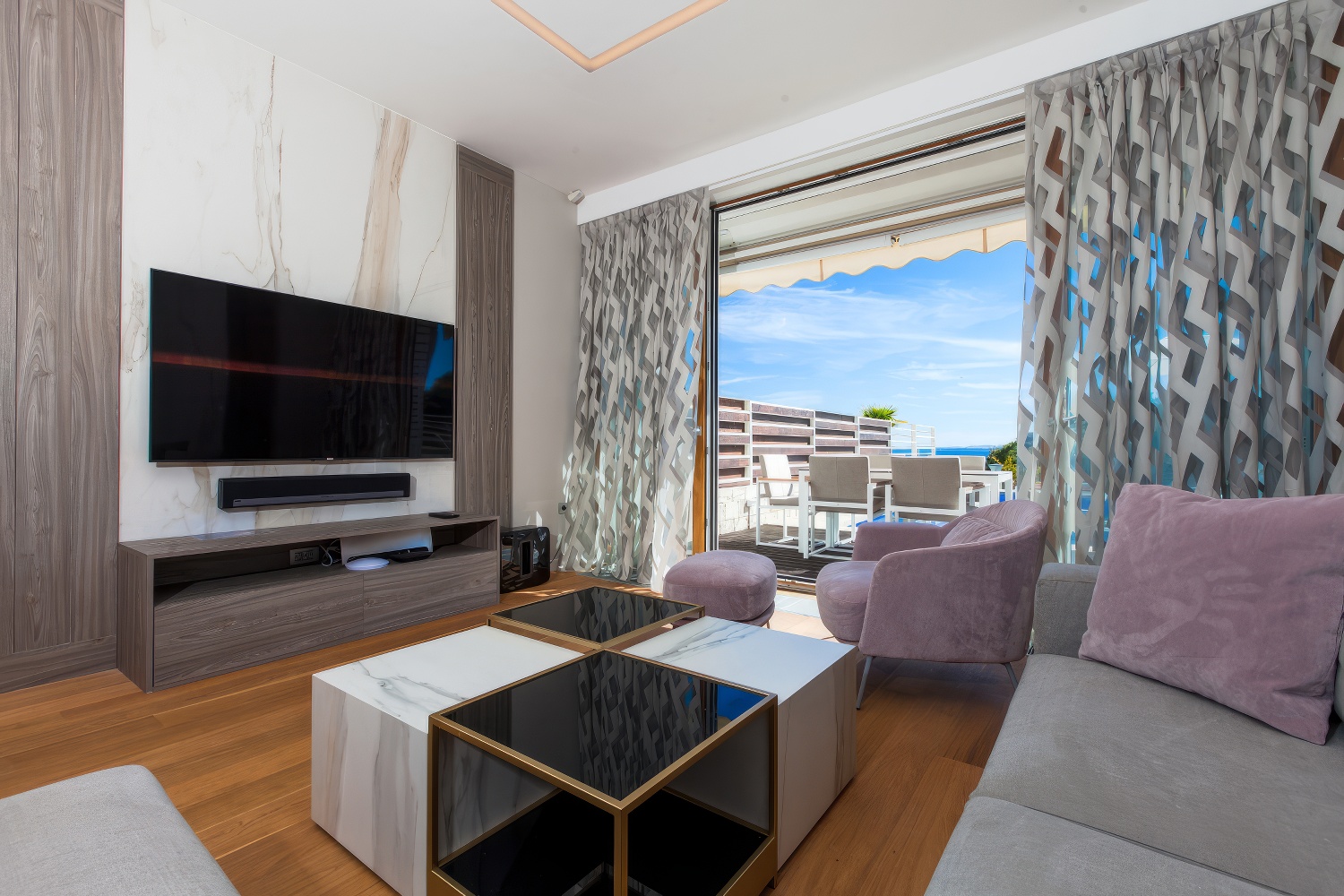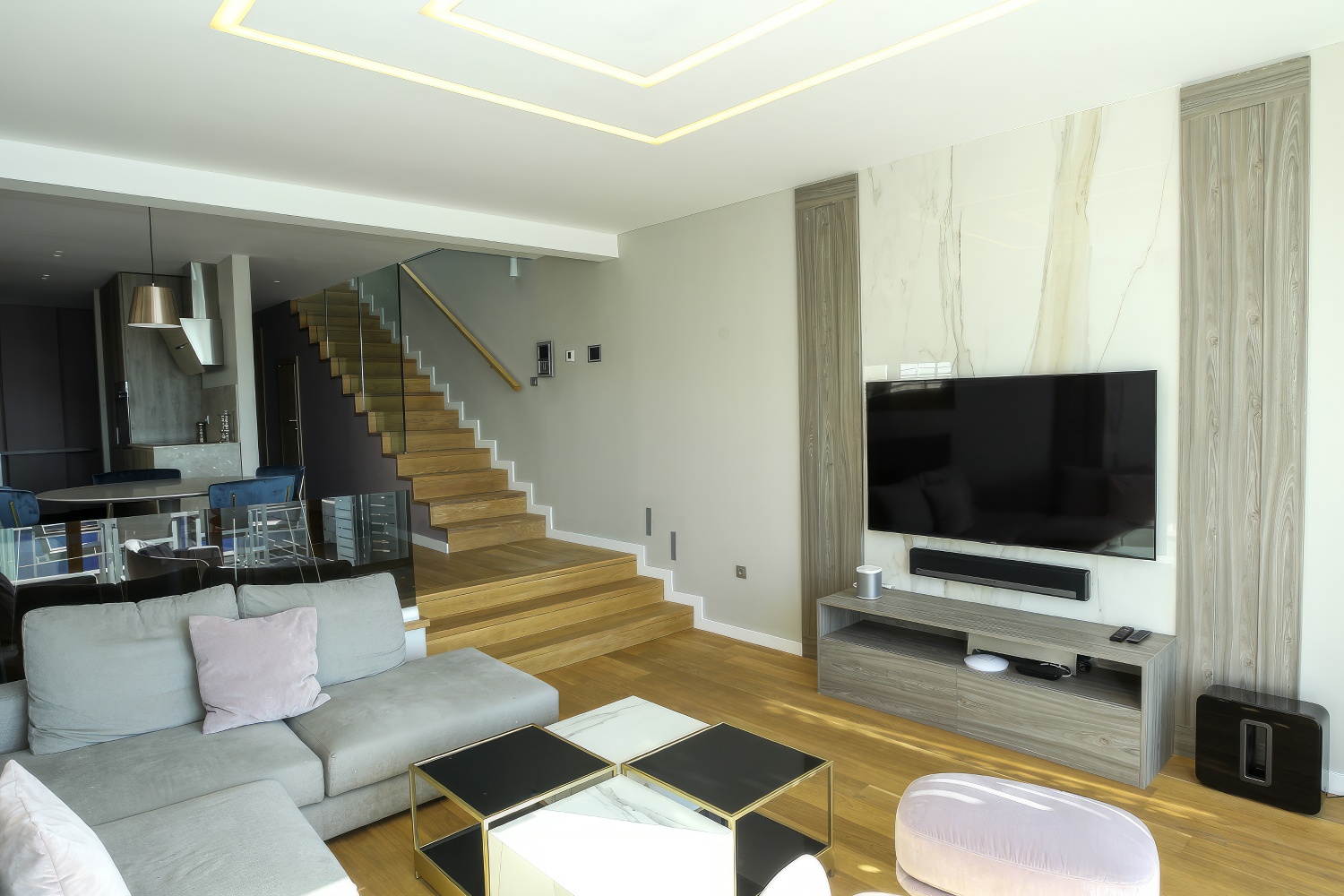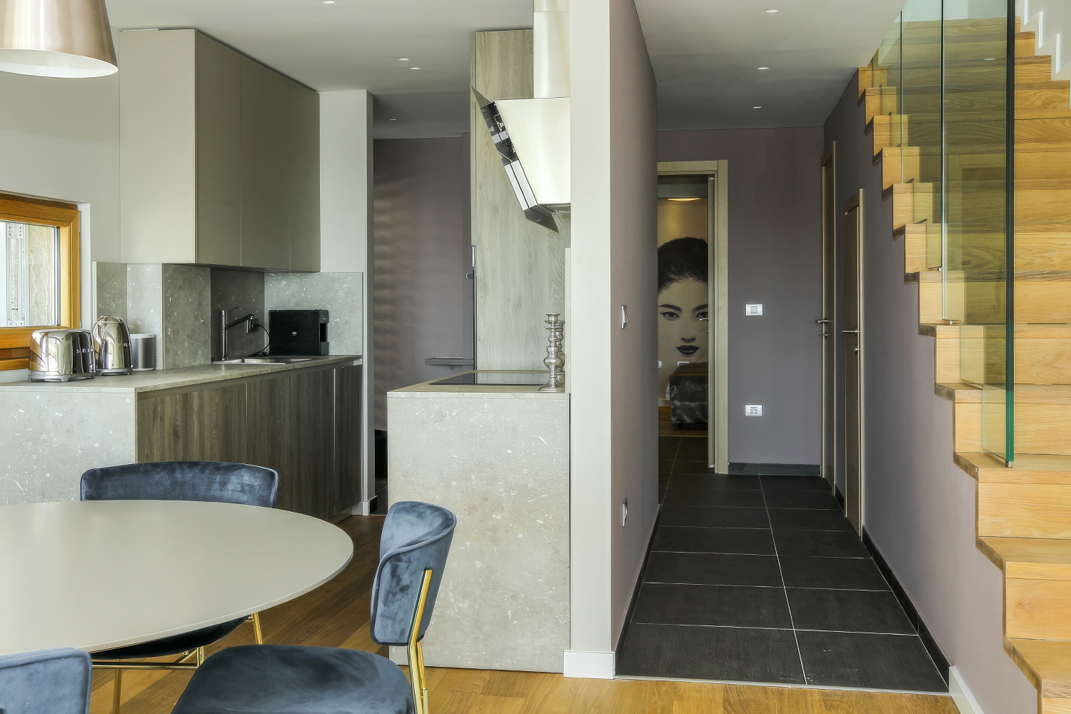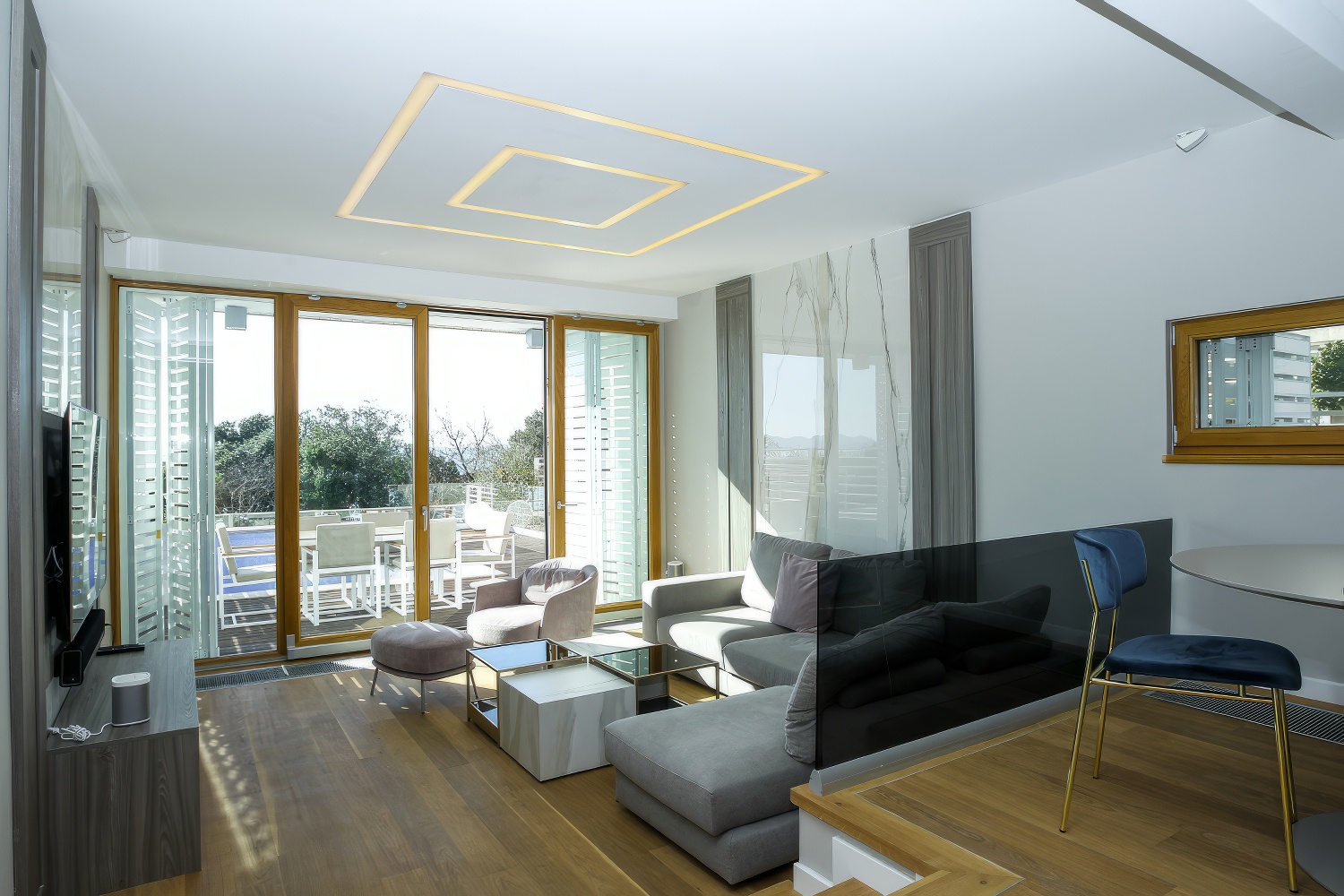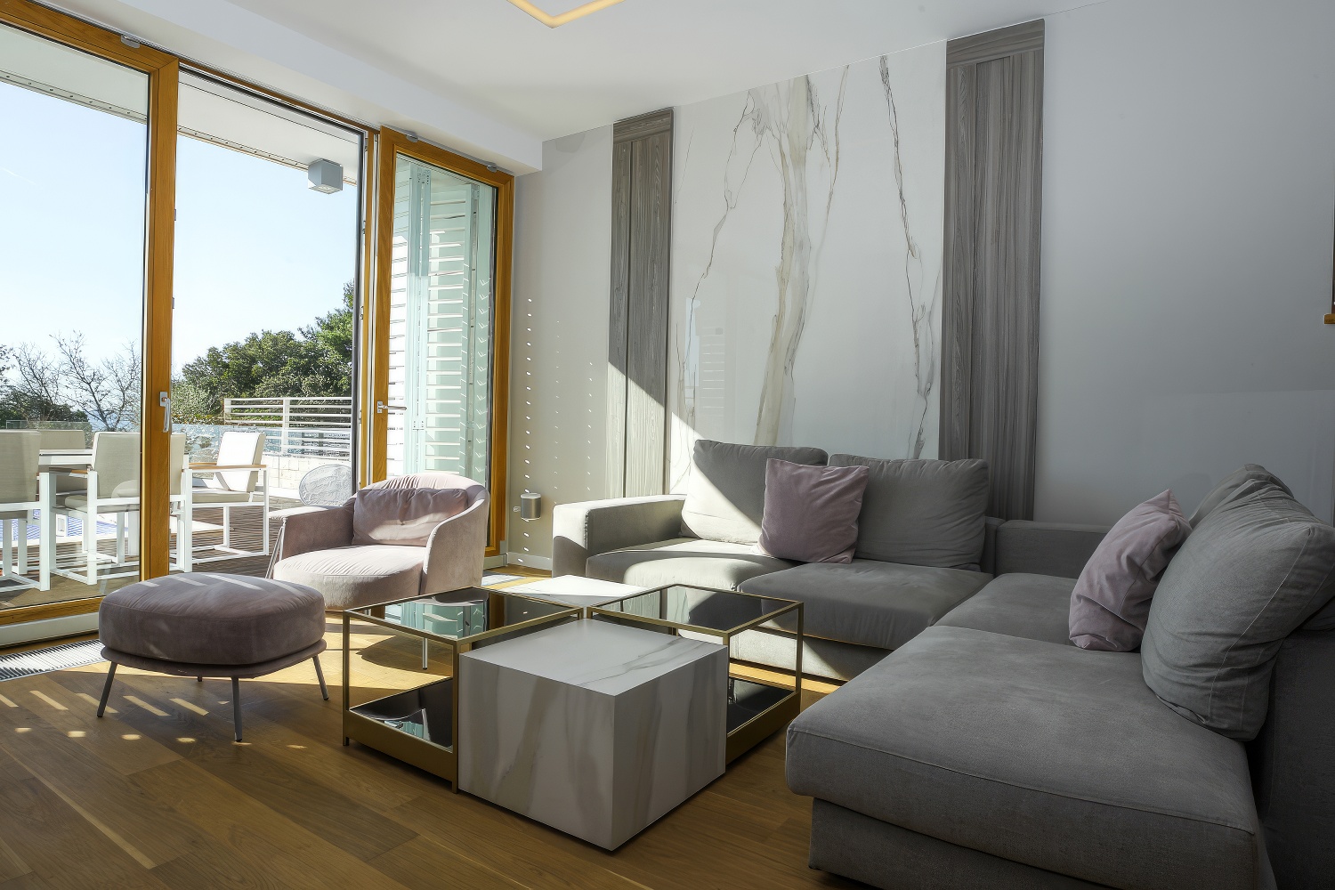 Im Untergeschoss findest du eine voll ausgestattete, moderne Küche. Angrenzend daran befinden sich ein geräumiges Esszimmer und Wohnzimmer mit direktem Zugang zur Terrasse des Hauses. Auf der anderen Seite des Untergeschosses liegt ein großes Schlafzimmer mit einem Doppelbett und einem eigenen Badezimmer. Zusätzlich gibt es eine separate Toilette. Das Wohnzimmer ist durch große Glaswände von außen abgetrennt, wodurch mediterranes Licht den gesamten Innenraum durchflutet. Diese Gestaltung verbindet den Innenraum mit der Außenseite der Villa, wo sich ein Swimmingpool mit Liegestühlen und Gartenmöbeln befindet.