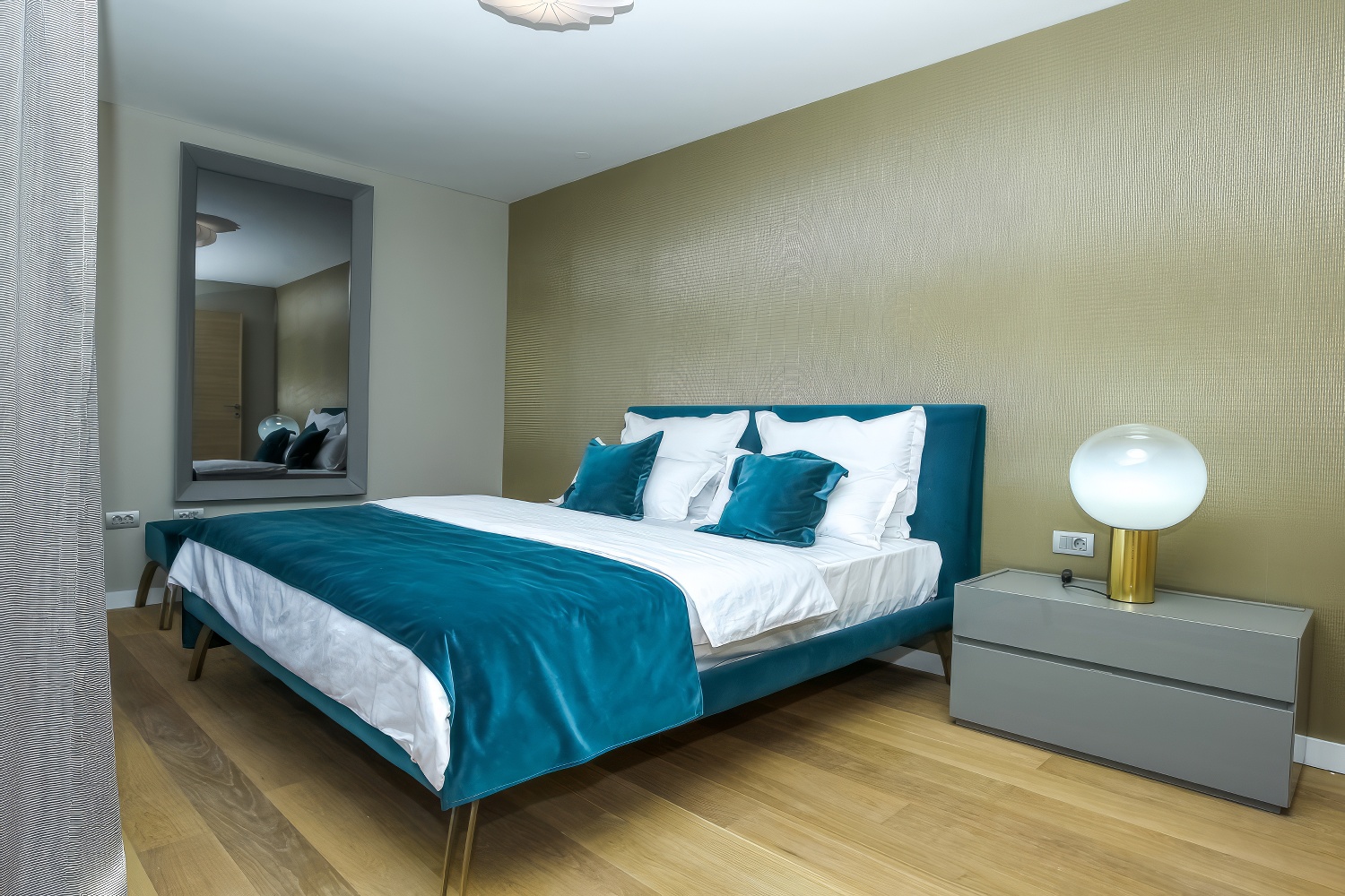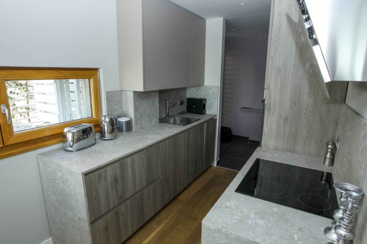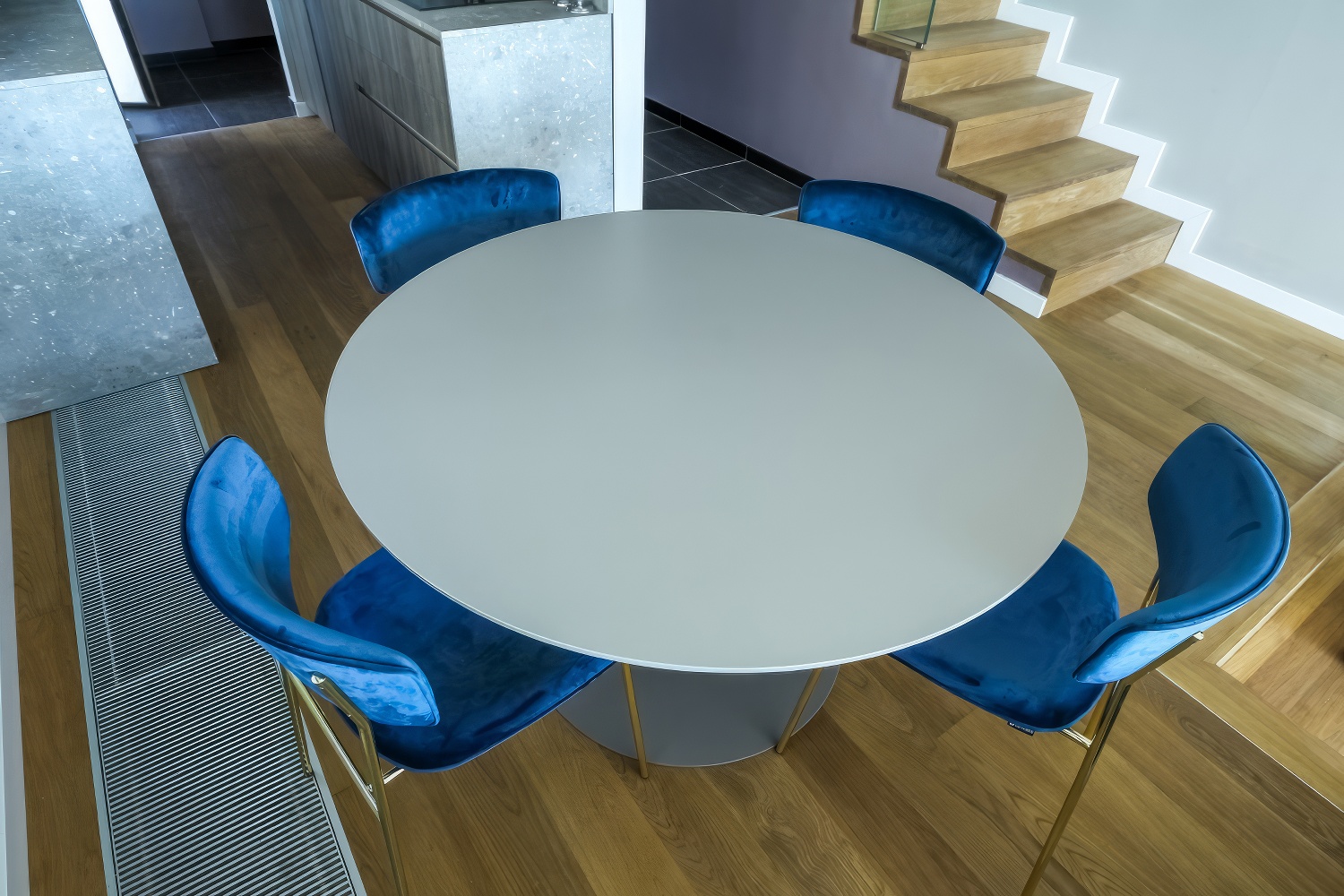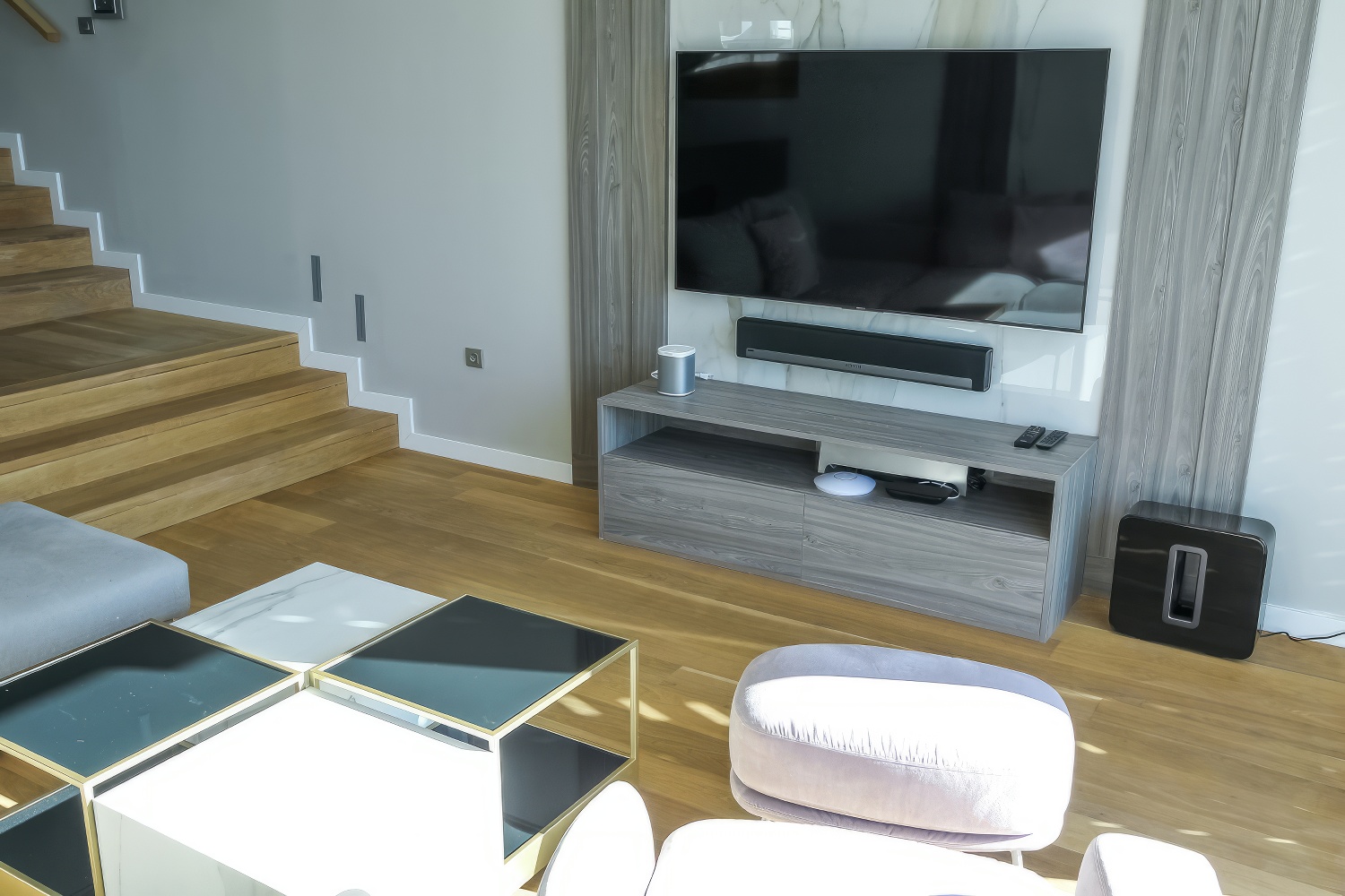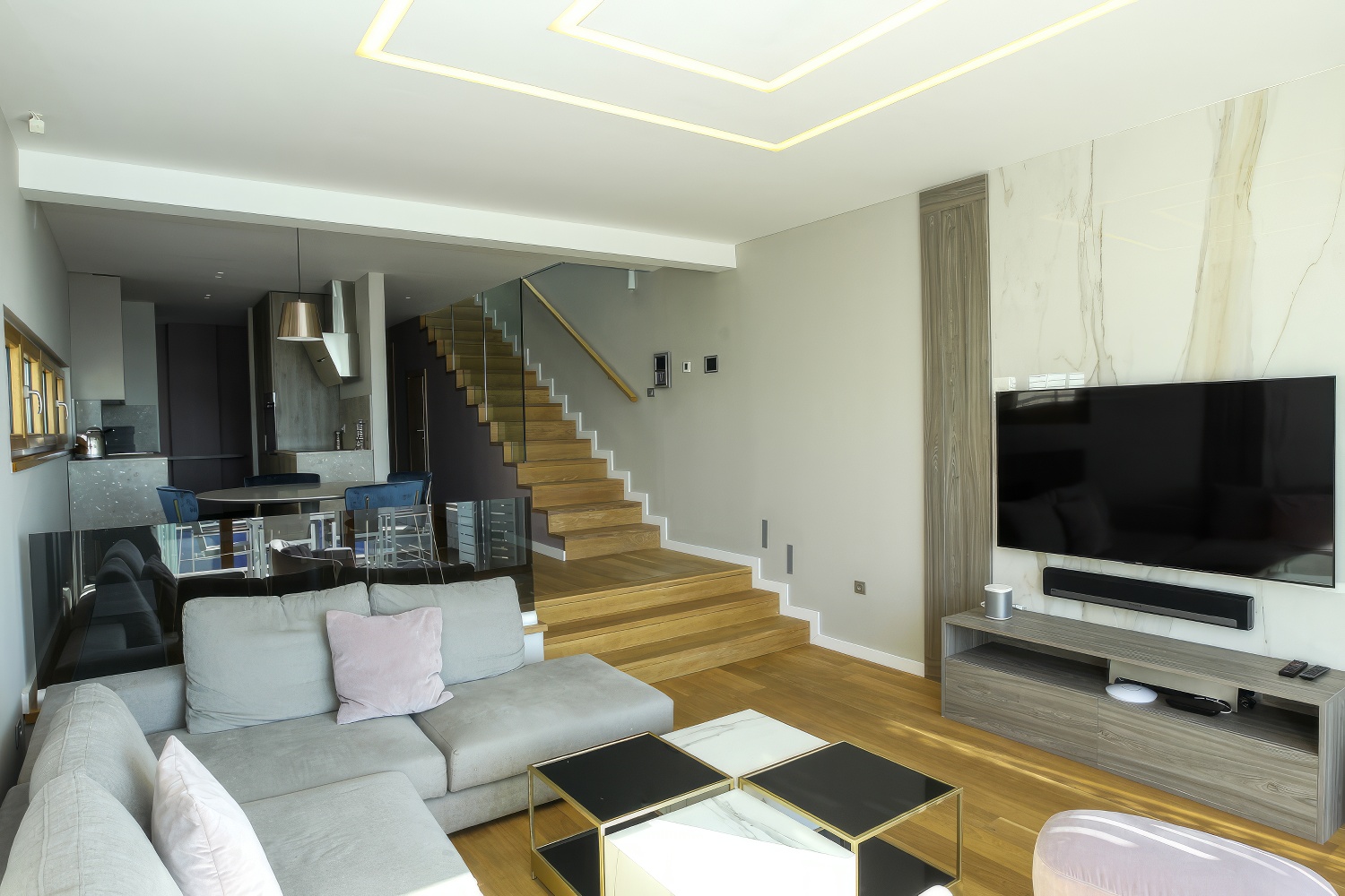 Im Untergeschoss findest du eine voll ausgestattete, moderne Küche. Angrenzend daran befinden sich ein geräumiges Esszimmer und Wohnzimmer mit direktem Zugang zur Terrasse des Hauses. Auf der anderen Seite des Untergeschosses liegt ein großes Schlafzimmer mit einem Doppelbett und einem eigenen Badezimmer. Zusätzlich gibt es eine separate Toilette. Das Wohnzimmer ist durch große Glaswände von außen abgetrennt, wodurch mediterranes Licht den gesamten Innenraum durchflutet. Diese Gestaltung verbindet den Innenraum mit der Außenseite der Villa, wo sich ein Swimmingpool mit Liegestühlen und Gartenmöbeln befindet.