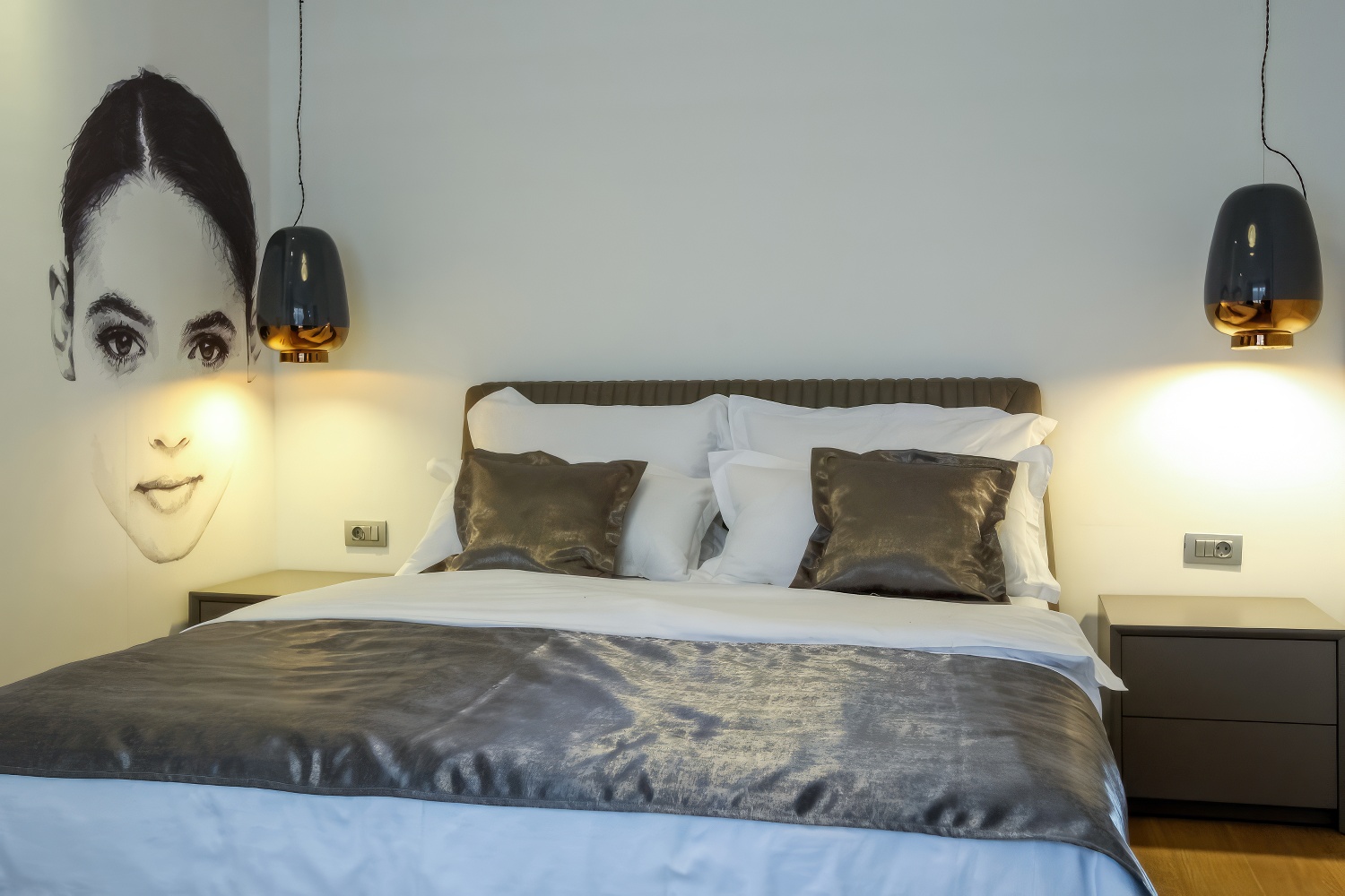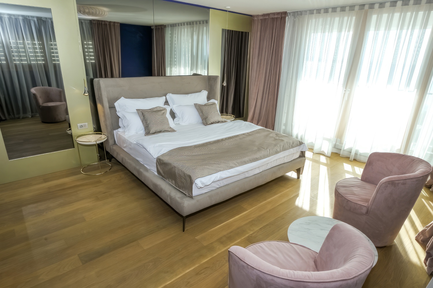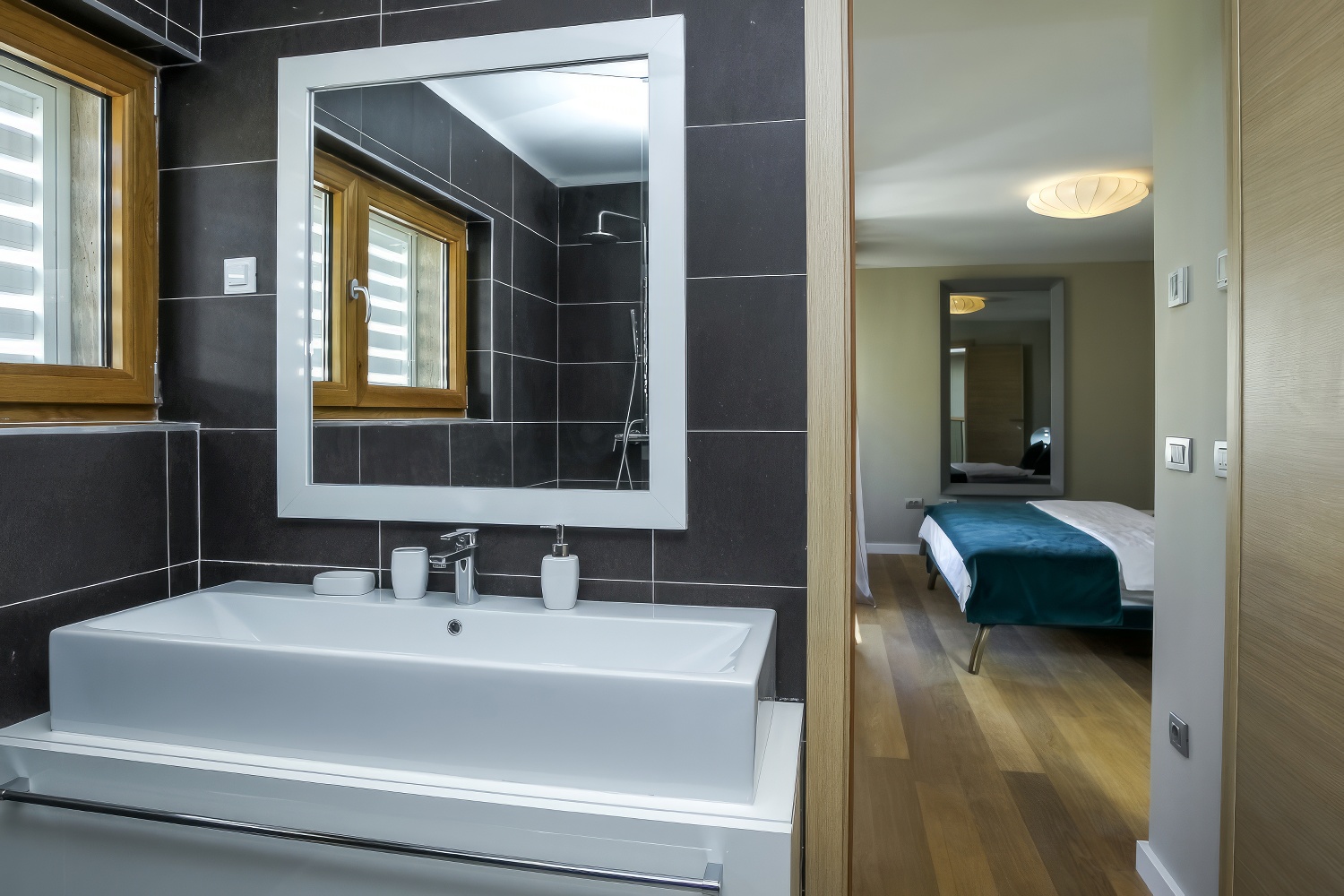 Im Obergeschoss erwarten dich zwei komfortable Schlafzimmer mit Doppelbetten, jeweils mit eigenem Bad und Loggia.
