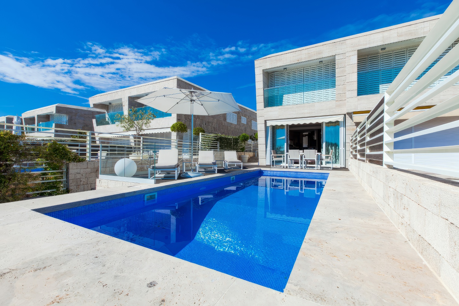 Ein Pool mit Liegestühlen und Terrasse mit Gartenmöbeln lädt dich ein, die Meeresaussicht in vollen Zügen zu genießen. Die Lage des Hauses direkt am Strand rundet das Erlebnis perfekt ab.